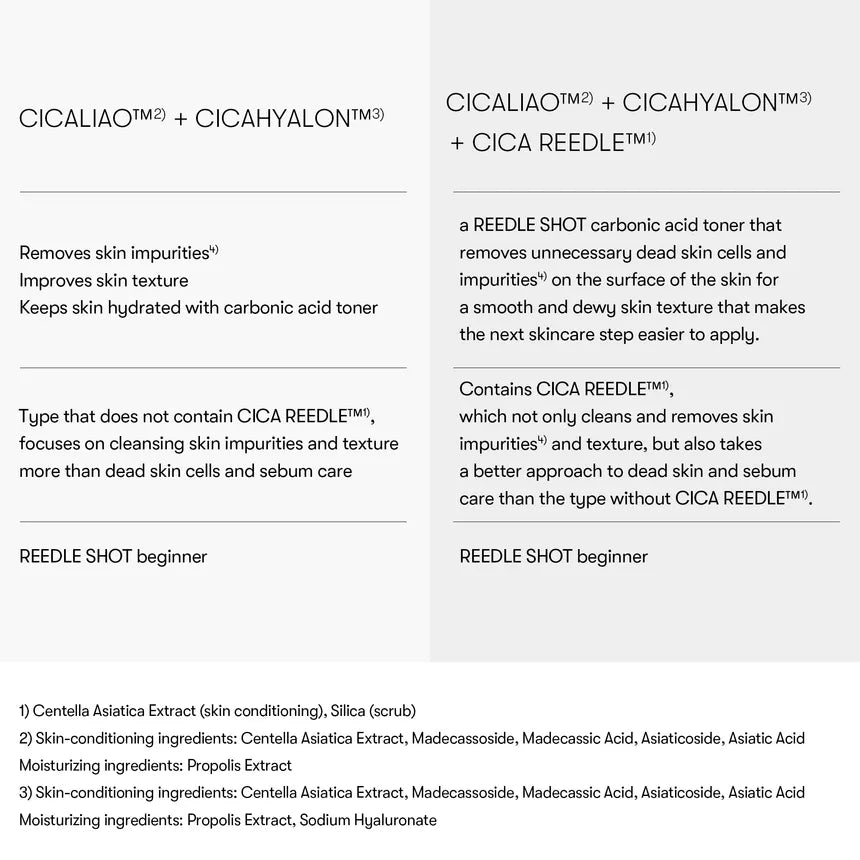 - CICA Reedle™ & CICAHYALON™: Soothe the skin, improve texture and boost hydration.