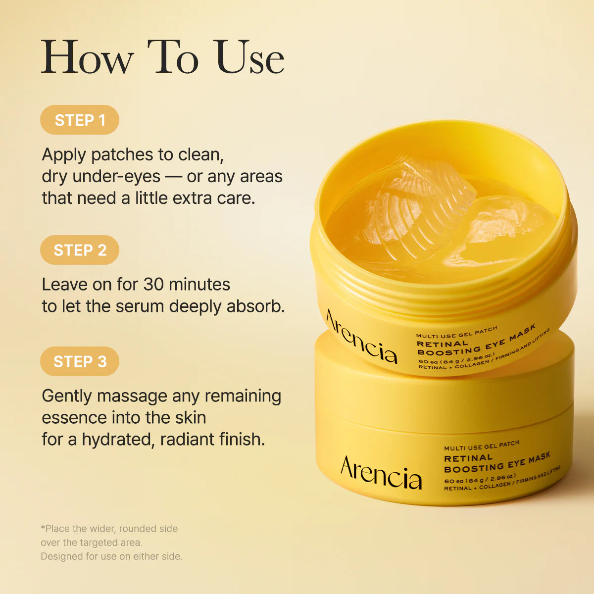 The Retinal Boosting Eye Mask Patch is a gentle yet effective hydrogel treatment powered by Retinal and 5 peptides to visibly smooth fine lines, reduce puffiness and firm targeted areas such as the under-eyes, smile lines and neck. The cooling hydrogel texture delivers deep hydration and long-lasting comfort, leaving skin looking plumper, firmer and more refined.